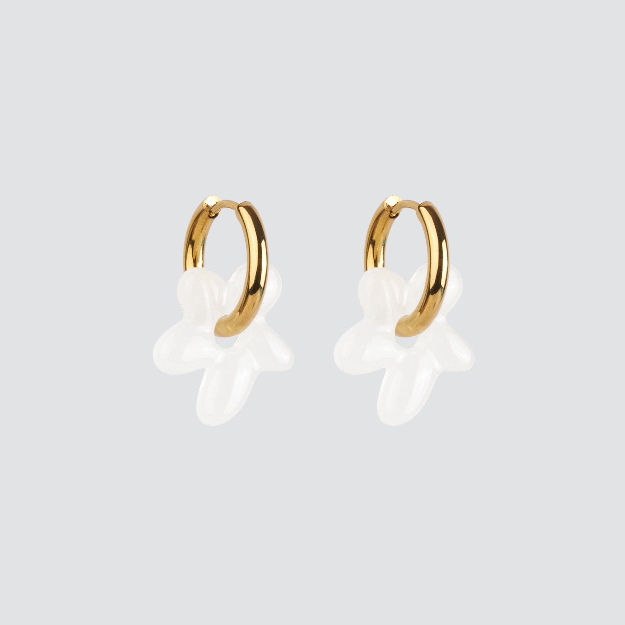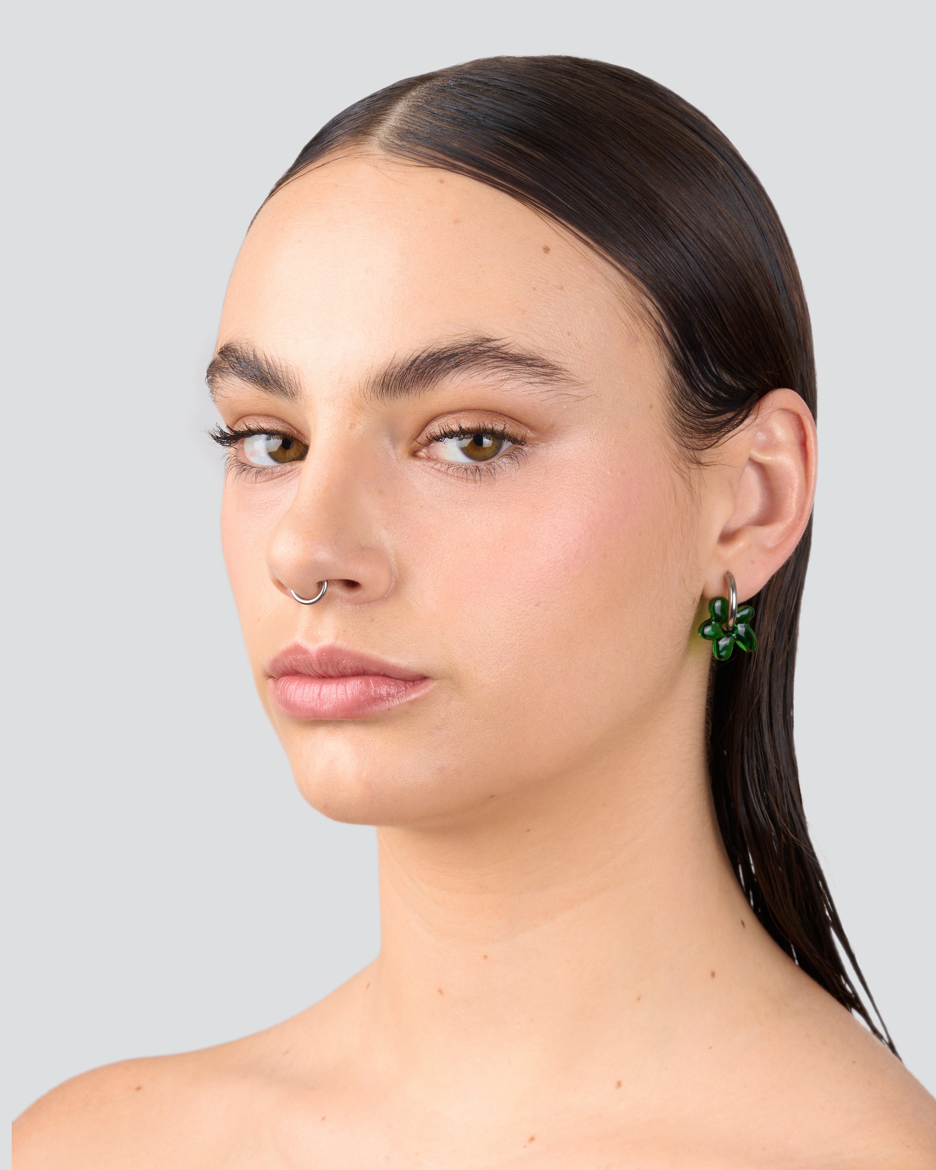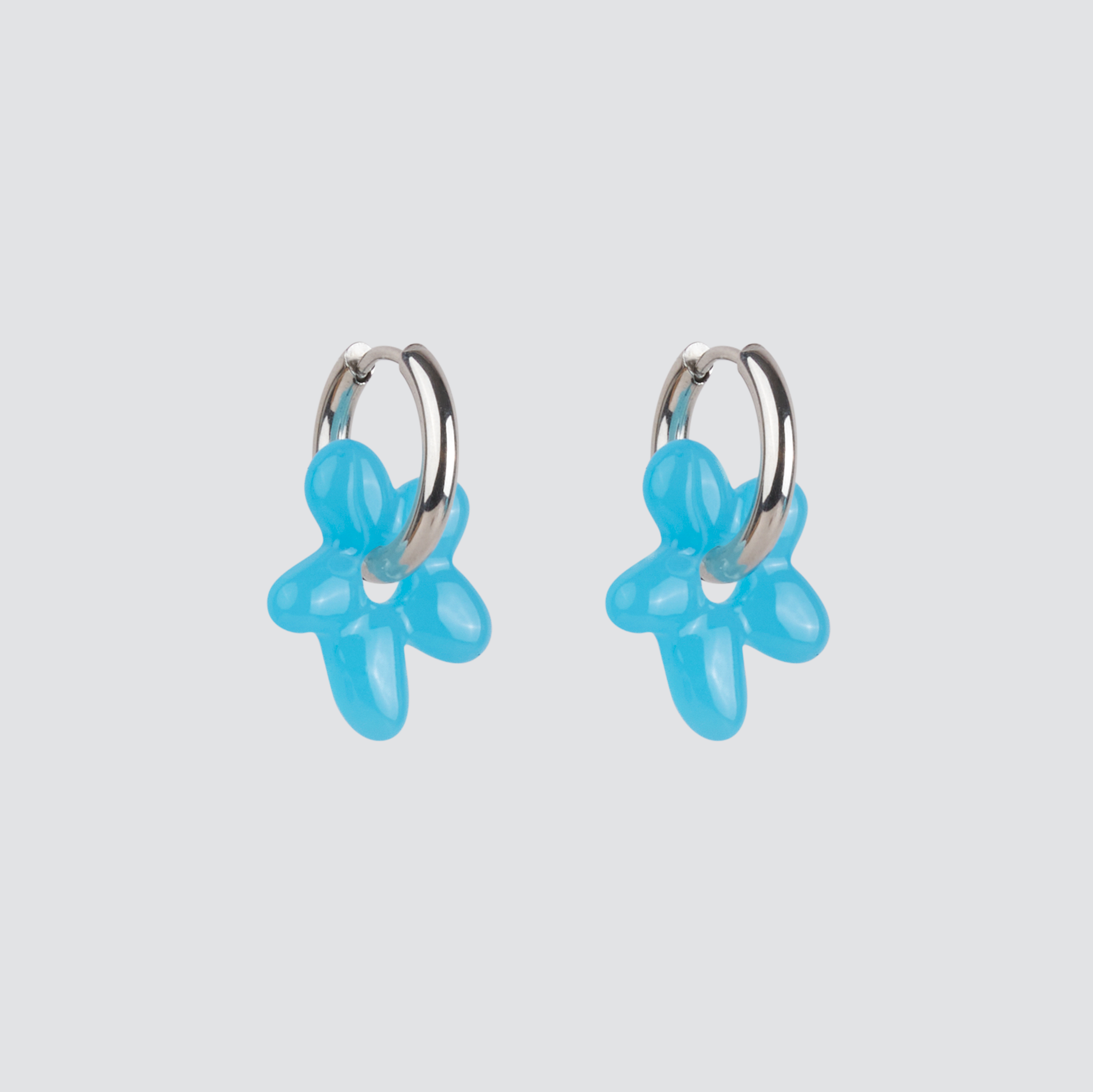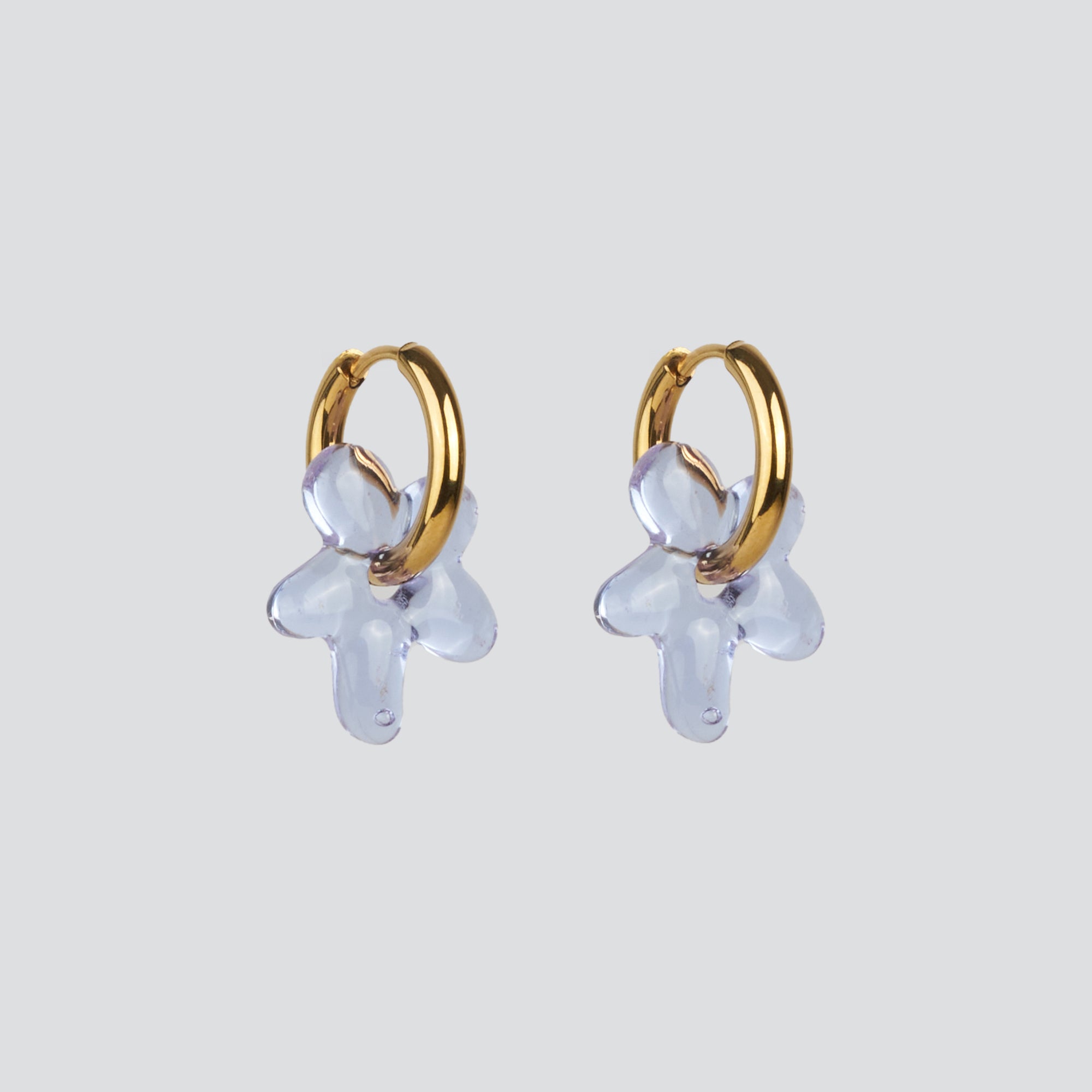 Aros compuestos de argollas de acero y charms con forma de flor hechos de vidrio, disponibles en versión mini y tradicional.